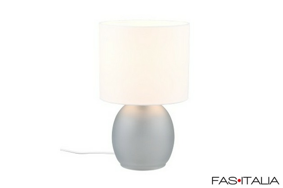 Lampada da tavolo con base in vetro grigio e paralume in tessuto bianco.