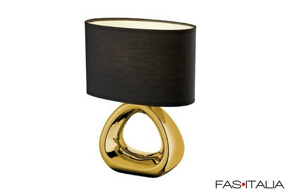 Lampada da tavolo con base in ceramica colore oro e paralume in tessuto nero.