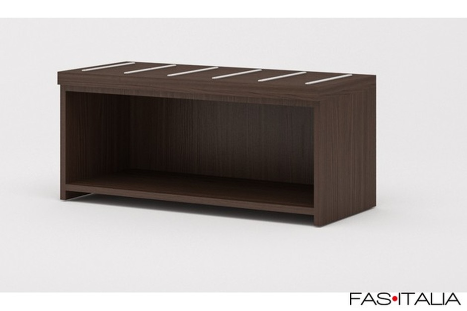 Portavaligie con liste paracolpi sul piano. Vano a giorno inferiore. Dimensioni: 93,2x44,9x41 cm (LxPxH). Altezza del piano portavaligie: cm 41.