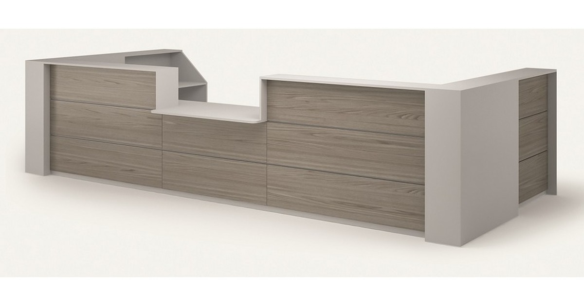 Bancone reception ampio, con superficie frontale di 5 metri. Il bancone ha delle mensole perimetrali lungo tutto il perimetro, e nel centro del lato lungo si trova una isola di altezza inferiore per favorire il contatto con l'ospite. All'interno del bancone si trovano delle scrivanie che seguono il perimetro della reception. Dimensioni: 500x220x110/70 cm (LxPxH), profondità del bancone 84 cm. Completo di 1 cassettiera e 1 mobile con anta. Il piano utile delle scrivanie è a 74 cm, la mensola superiore all'altezza di 111,8 cm.